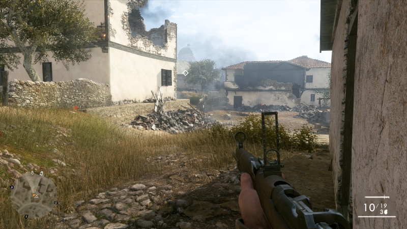 Ich sprinte durch eine Mondlandschaft; um mich herum Schüsse, Gebrüll, explodierende Granaten, Rufe von Befehlen, sterbende Soldaten. Vor mir erscheint ein Gegner. Ich erschieße ihn. Auf dem Bildschirm erscheint 160.