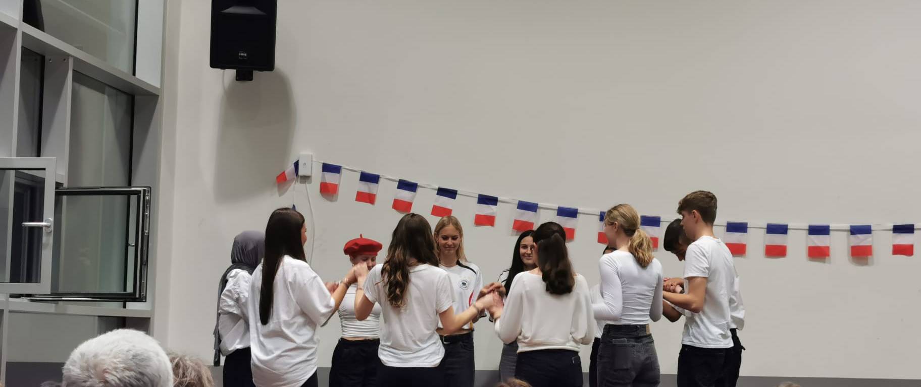 Um 18:30 Uhr ging es mit einem Sektempfang los. Hierbei hatten wir Unterstützung von SchülerInnen aus der Q12, die uns ebenfalls beim Crêpeverkauf halfen. Eine Viertelstunde später wurden die Gäste offiziell von unseren beiden Moderatorinnen, Kaja und Lara, begrüßt. Daraufhin folgte ein erheiternder Sketch – eine deutsche Familie, die mit Sprachbarrieren in ihrem Frankreichurlaub zu kämpfen hat. Nach einem tosenden Applaus für die Schauspieler ging es direkt weiter mit einer besonderen Tanzeinlage. Aufgeführt wurde ein bretonischer Volkstanz, welcher äußerst gut beim Publikum ankam. Die anschließende dreiviertelstündige Pause war auch reichlich mit Programm gefüllt: Hier konnte man sich zwischen zwei Sprachkursen entscheiden (Urlaubs- und Anfängersprachkurs), ein Live-Interview mit einer Schülerin des AKGs über ihr Austauschprogramm in Frankreich anhören, am Gewinnspiel mit einem Quiz über die Plakate oder an der Mitmachaktion mit der Frage: „Was bedeutet die deutsch-französische Freundschaft für dich?“ teilnehmen. Eine kleine Stärkung konnte sich alle beim Crêpe- und Getränkeverkauf holen. Passend zu einem französischen Abend gab es ebenfalls Häppchen, bestehend aus Baguette, französischem Käse und Trauben.
