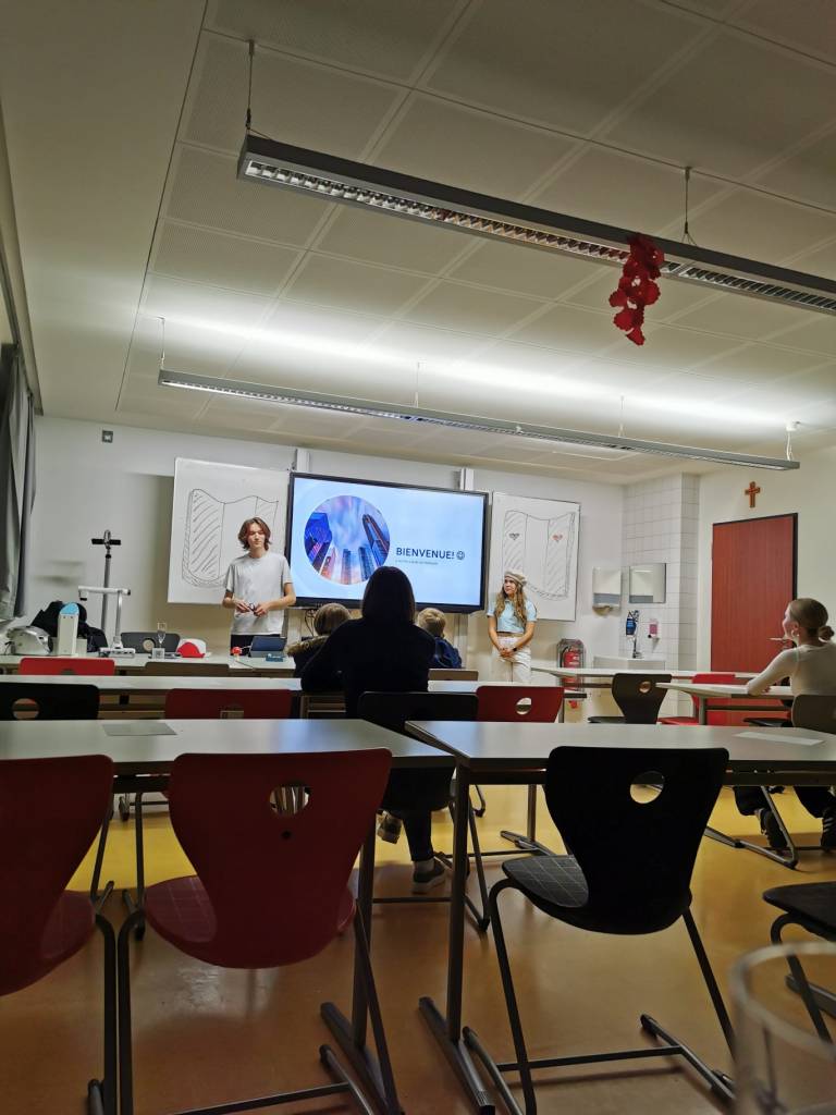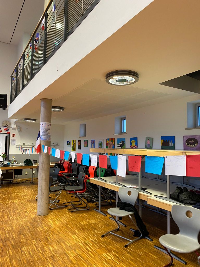 Die eigentliche Aktion unseres P-Seminars fand am 26. Oktober 2023 statt: Ein französischer Abend in der Mensa des AKG. Hierbei haben wir diverse kreative Aktionen geplant und vorbereitet, um die verschiedenen Facetten Frankreichs und der gemeinsamen Freundschaft zu präsentieren. Nach der Generalprobe und letzten Einkäufen gingen am Tag selbst die allerletzten Vorbereitungen los. Plakate wurden aufgehängt, Mitmachaktionen fertiggestellt und Tanzeinlagen nochmals geprobt.