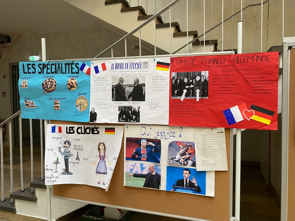 Am 22. Januar 2023 hat der Elysée-Vertrag, der die Grundlage für die langjährige deutsch-französische Freundschaft bildet, sein sechzigjähriges Jubiläum gefeiert. Bereits zu diesem Anlass hat das P-Seminar Französisch unserer Schule eine Mitmachaktion für die SchülerInnen gestaltet. Dabei mussten die SchülerInnen mit Hilfe von Plakaten ein Kreuzworträtsel über die deutsch-französischen Beziehungen lösen, wobei sie einen Crêpe-Gutschein für den Pausenverkauf gewinnen konnten.