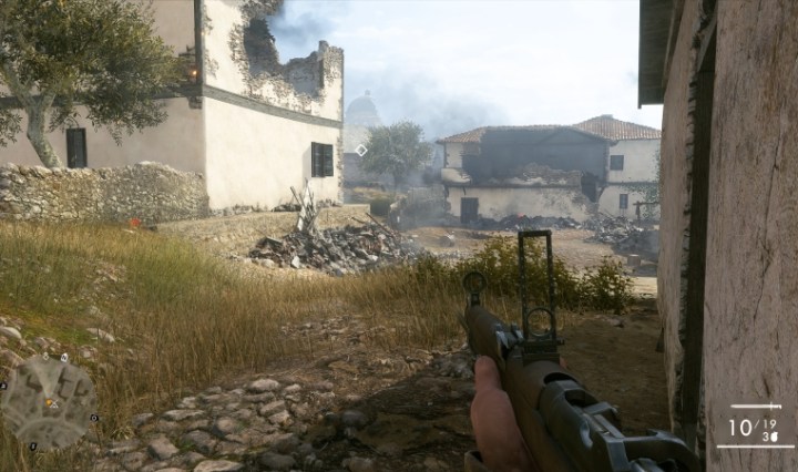 Ich sprinte durch eine Mondlandschaft; um mich herum Schüsse, Gebrüll, explodierende Granaten, Rufe von Befehlen, sterbende Soldaten. Vor mir erscheint ein Gegner. Ich erschieße ihn. Auf dem Bildschirm erscheint 160.